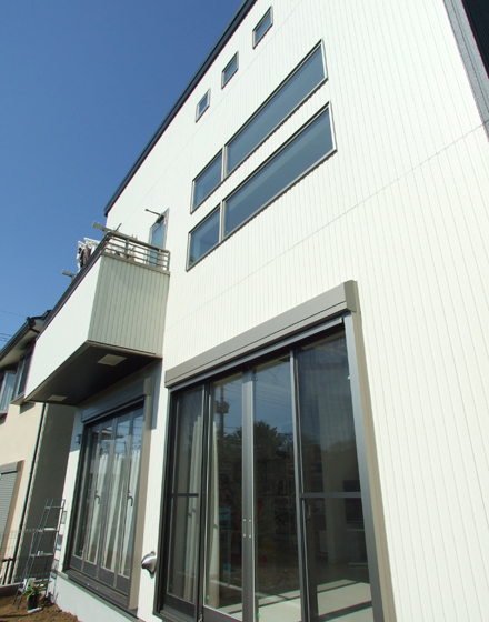 「外観のテーマは、メタリックな印象を持たせたモノトーン調のものにしたかった」というご主人。数あるサイディングから色や材質をチョイス。また内装も、建具、面材、クロスなど白で統一。子供達が思い切り遊べるよう、強度の高い床材もオプションで採用。