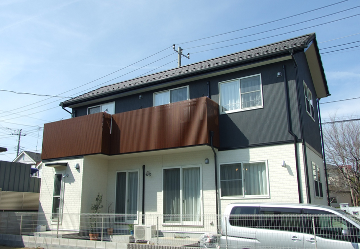 「木造りの家に絶対したかった」という奥様の最大のこだわりが、全居室の床、建具、廊下などに敷き詰められたパイン材。自然素材の珪藻土の壁など健康にも配慮。また、外観は、モノトーンの配色に黒の瓦屋根。バルコニーには木目調の飾り格子を。