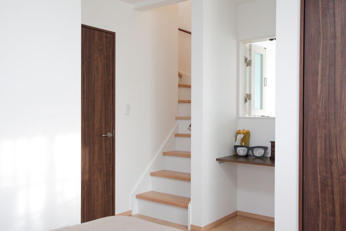 2階主寝室。小屋裏収納(E-space)へ上がる固定階段を主寝室内に設置。