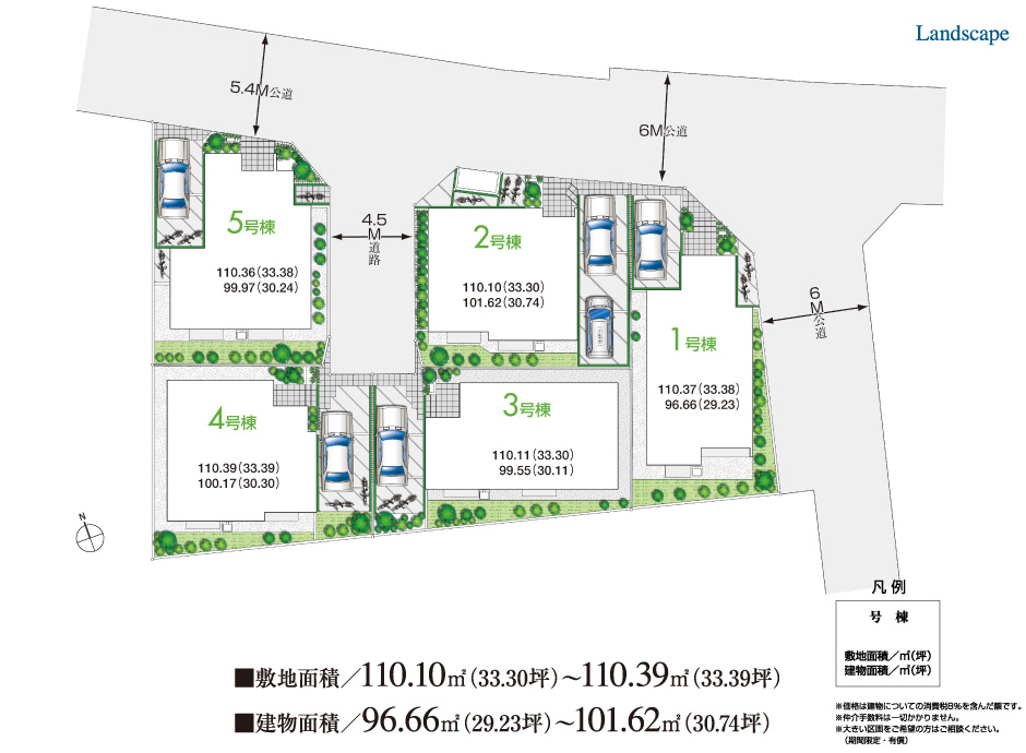 邸宅地にふさわしい静寂に調和する、シンプルながらもスタイリッシュな印象の5邸です。