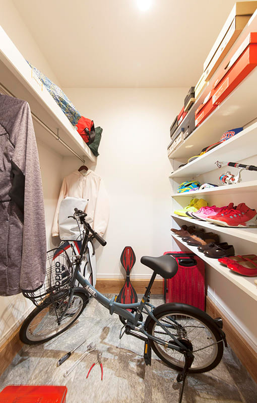 玄関に設けた土間収納は、シューズ以外にもベビーカーやゴルフバックなど