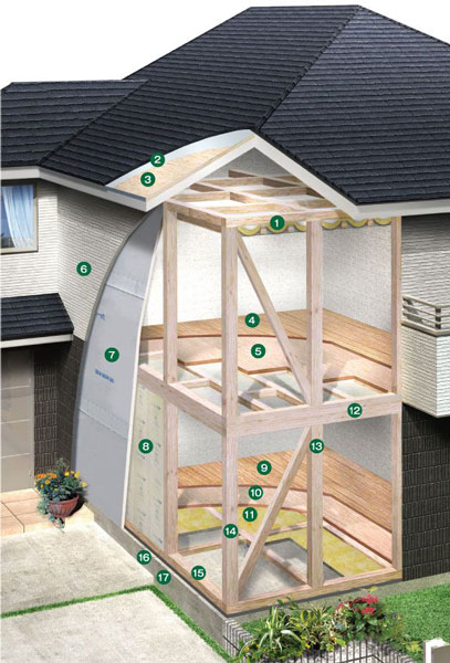 「柱」は、木造軸組工法の採用により「軸の強さ」を追求。加えてダイライトMSを「壁」に、24mm厚の剛床パネルを「床」に配することにより「面の強さ」を高めています。