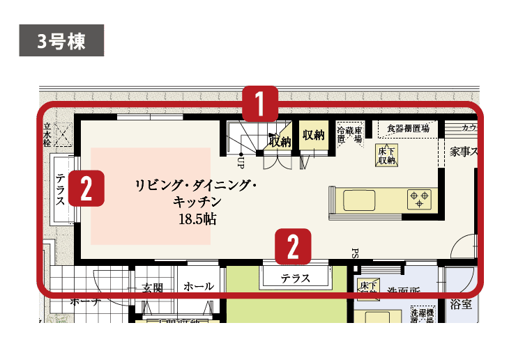- 18.75帖の広々としたリビング・ダイニング・キッチン