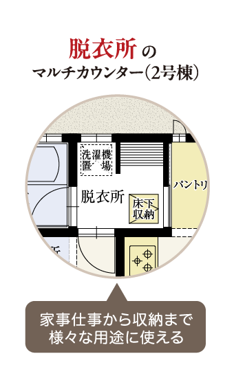 - 空間を広々すっきり使え、食品・生活用品の整理や収納に役立つ床下収納をキッチンと洗面所に設置。