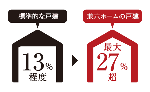 マンションでは収納率8%~10%、一戸建て住宅では収納率13%程度が標準といわれている収納率。兼六ホームではプランニングの工夫により、常に高い収納率を実現。高収納率の邸宅にすると、収納家具が減り、広い居住空間を確保することが可能になります。