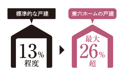 兼六ホームでは一戸建ての収納率が13%程度のところ、最大26%超の広さを実現しました。