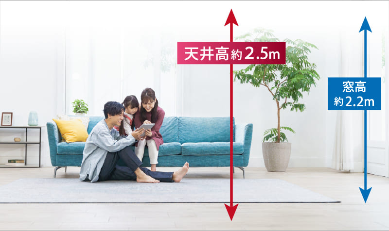 高い天井高や掃き出し窓など、開放的で心地よい生活空間を追求