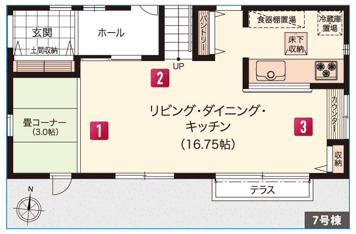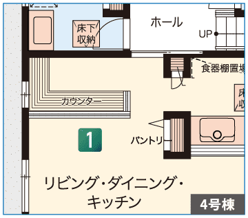南面の光を広く取り込むワイドスパンのリビング・ダイニング・キッチンを設けたプラン。