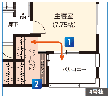 主寝室にカウンター付きのウォークインクローゼットを設置。