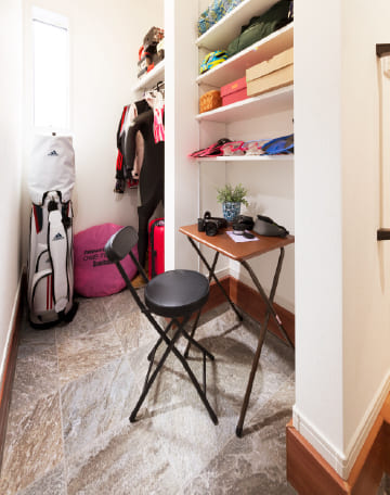 玄関に設置した土間収納は、シューズ以外にもゴルフバッグやアウトドア用品など