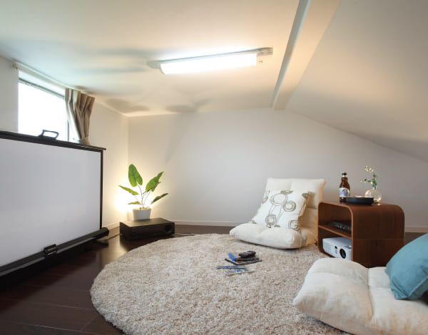固定階段で気軽に行き来できるEスペースは、収納以外にも書斎にしたり、