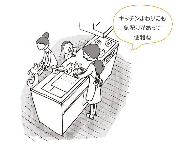 洗濯やお掃除など家事がスムーズに行えるよう、キッチンの近くに水回りを集めるなど、