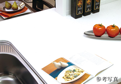 カウンタートップ- 華やかな印象にする人造大理石のカウンタートップ。毎日使うキッチンだから機能的でお手入れしやすく、キズに強いものを選びました。