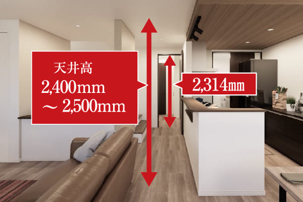 完成予想CG - 1Fは約2,400〜2,500mm、2Fは約2,350mmの天井高。縦に広がるゆとりと開放感を感じられます。窓も約2.2mのハイサッシを採用し、自然光をたっぷり取り込める設計です。