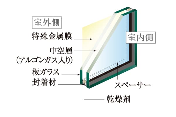 - 断熱性の高い、陽射し遮蔽型タイプのペアガラスを全窓に採用。結露防止効果や省エネ効果もあり、室内を快適に保ちます。(アルゴンガス入り)