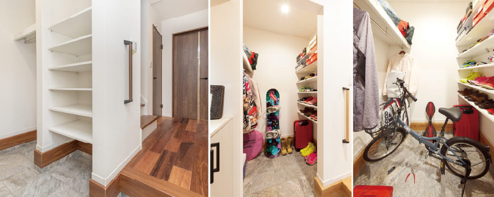 スポーツ用品など室内に置きにくいかさばる物までスムーズに収められる、便利で使い勝手の良いスペースです。