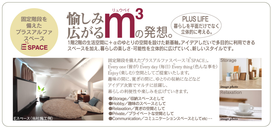 収納スペース、趣味のスペース、書斎、季節ものや大物の収納スペースとして…多目的に利用できる出入りに便利な固定階段を備えたEスペースを(15棟)に設置。